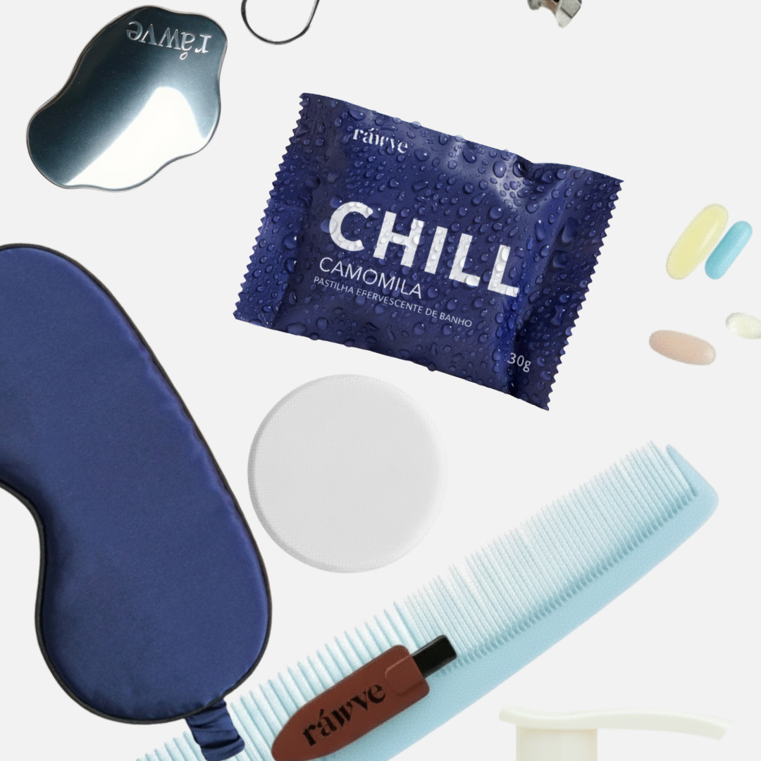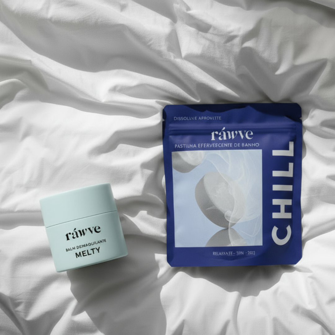 A Sensory Box Ráwve reúne o Balm Melty, o Shower Oil e as Pastilhas Efervescentes em um único ritual de pausa e presença.
