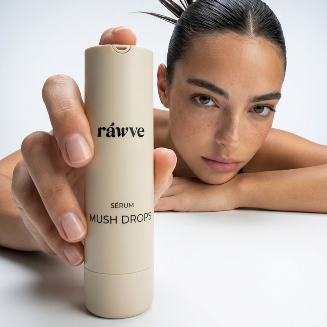 Mush Drops é um sérum facial com extrato de cogumelo reishi, peptídeos, ouro coloidal e ativos de hidratação profunda, pensado para peles cansadas e sensíveis à rotina diária.